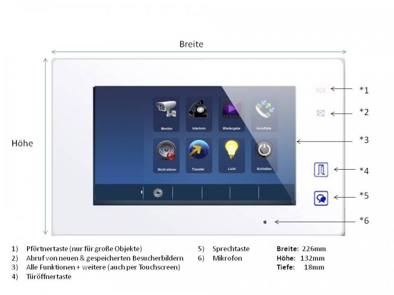 - Interkom-Funktion: falls Sie mehrere Monitore in der Wohnung installiert haben, so können Sie wechselseitig miteinander kommunizieren. Das interne Gespräch kann nicht an der Tür gehört werden.